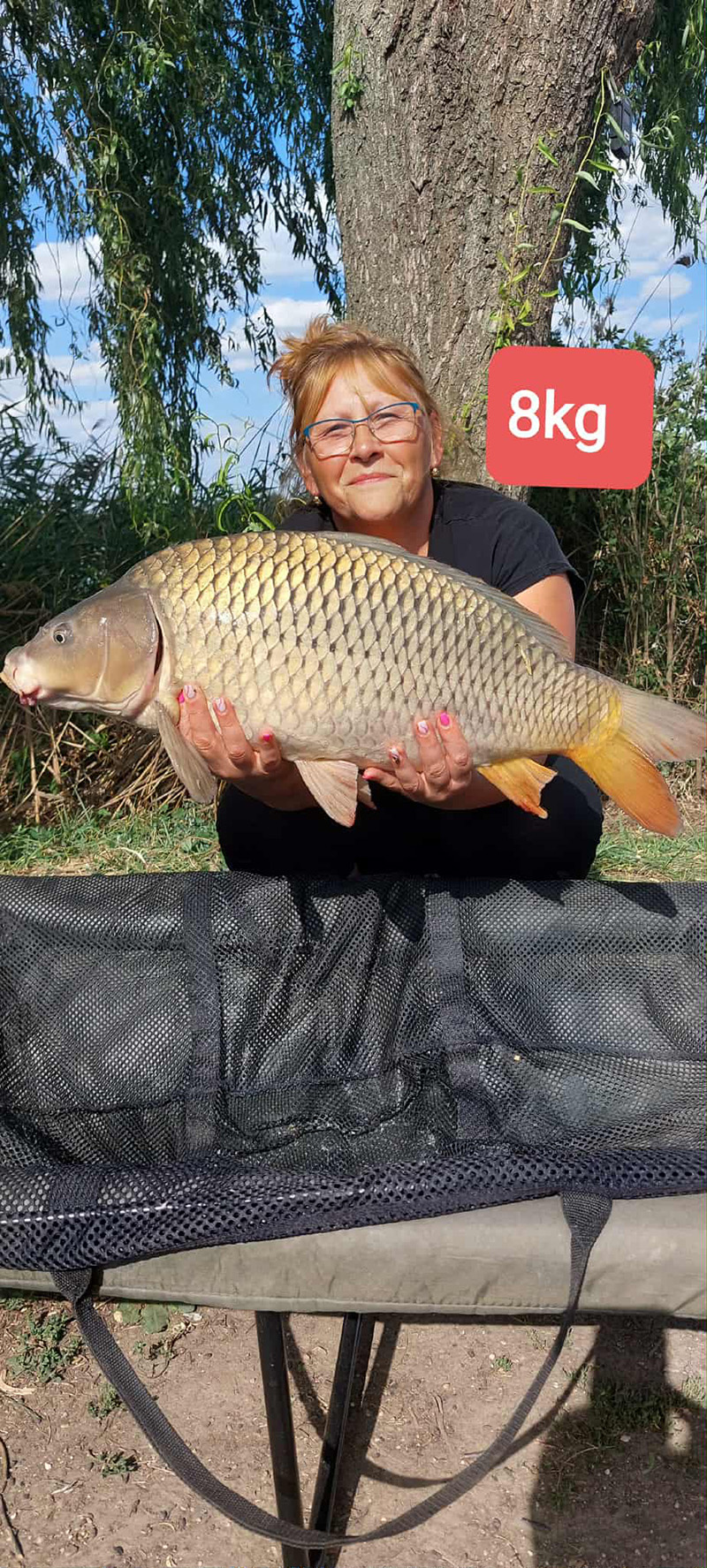 Fogási körülmények: Erőteljes kapással jelentkezett ez a csodálatos 8 kilós tőponty, nagy küzdelem volt, mert már az első kirohanásánál az akadót célozta meg, de sikerült megfordítanom, így 10 perces küzdelem után sikerült szákba terelni, mérlegelés, fertőtlenítve és máris visszakerült éltető elemébe, vígan úszik tovább. Csali, bojli volt, 24-es méretben, horog 6-os, zsinór 0,35-ös.