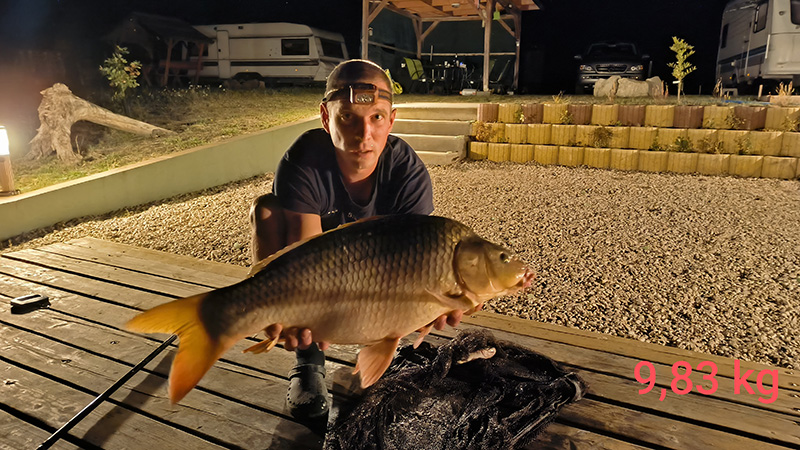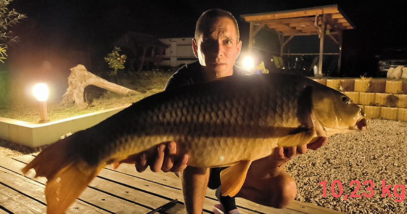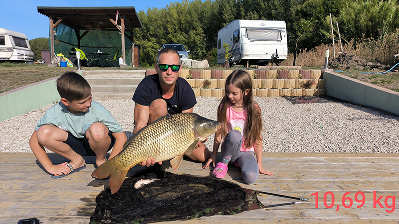 Fogási körülmények: Három a magyar igazság és egy a ráadás címmel szeretném megosztani veletek kedves Horgásztársaim, hogy egy hétnyi kapás nélküli éjszaka után augusztus 30. éjjel, 31. hajnal és szeptember 3. hajnal „beadta a bónuszt” a békésszentandrási Sirató-holtágon. 30-án kb. 21:40 körül megérkezett az első 10,26 kg mérlegelt súlyú pontyom. Szokásommal ellentétben, mivel fiatal volt még az éjszaka gyorsan újra csaliztam és visszadobtam. Szerencsére. 2 órára rá, nem sokkal éjfél előtt újabb füstölős kapásra ébredtem, és egy 9,83 kg-os pontyot sikerült szákba terelnem. Feleségemnek bizonygattam, hogy most már tényleg fogunk aludni, nem fog csipogni a jelző, nem dobok már vissza (csak szólok…füllentettem neki) nem bírtam ki csak visszadobtam, lesz, ami lesz alapon az előző ponty által megcsócsált csalival. Ez a dobásom hozta 31. hajnal fél 4-kor az éjjel legnagyobb súlyú pontyát melyet 10,69 kg-nak mérlegeltünk.